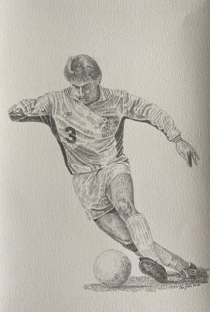 Chris Jones pushing the soccer ball upfield while at Quinnipiac University, 1985
